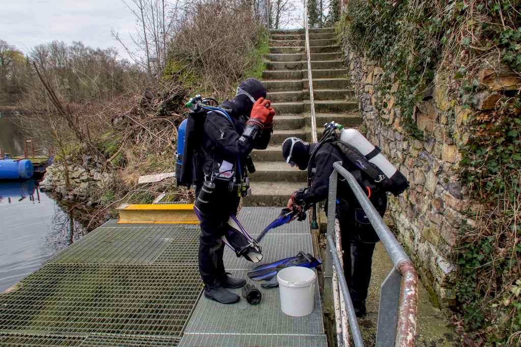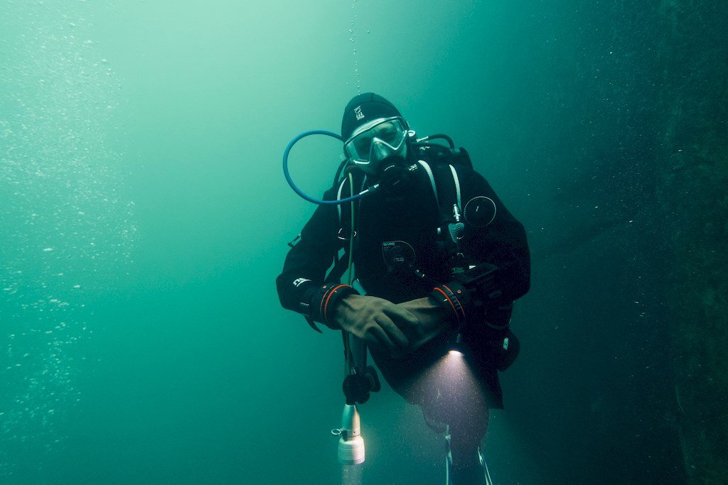 Dry suit diving is very different in terms of size, thick underwear, wider suit, diving torch with large batteries (it is often dark in the Belgian quarries), heating vest and its external battery.