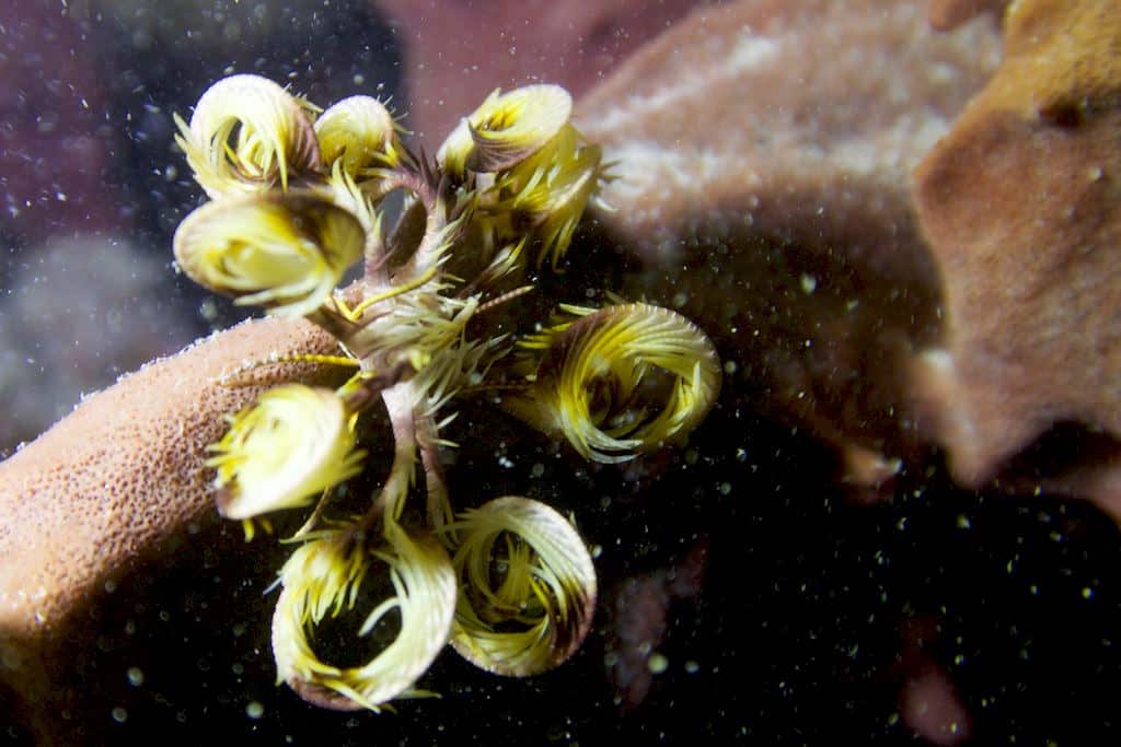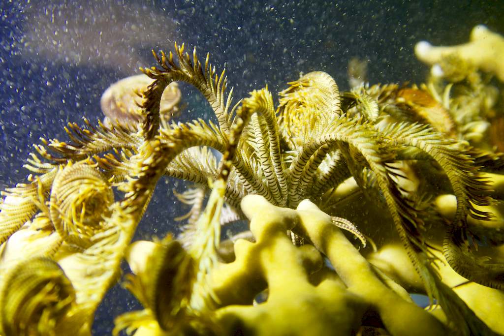 Nous faisons un premier tour avant d’explorer le haut de la pinacle. Un monde merveilleux s’offre à nous : des comatules par dizaines grouillent sous nos regards admiratifs.