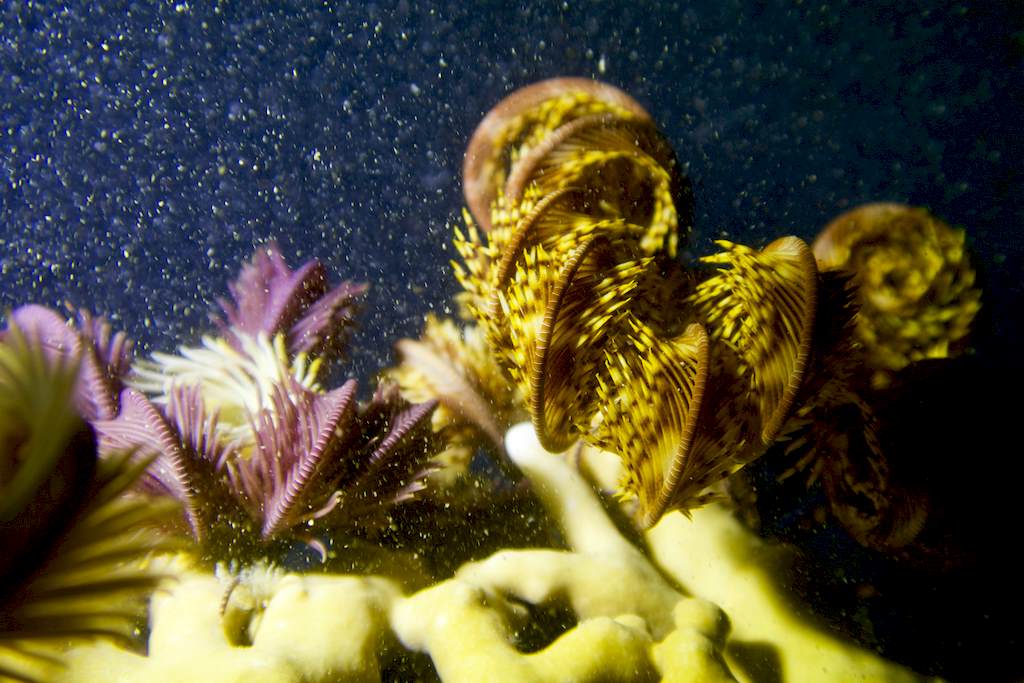 Soudain je sens comme une présence et m’écarte instantanément du rocher : quelques poissons lion ou rascasses remontent le long du tombant. Inexorablement attirés par le faisceau ultra large de ma lampe, ils viennent presque me frôler.