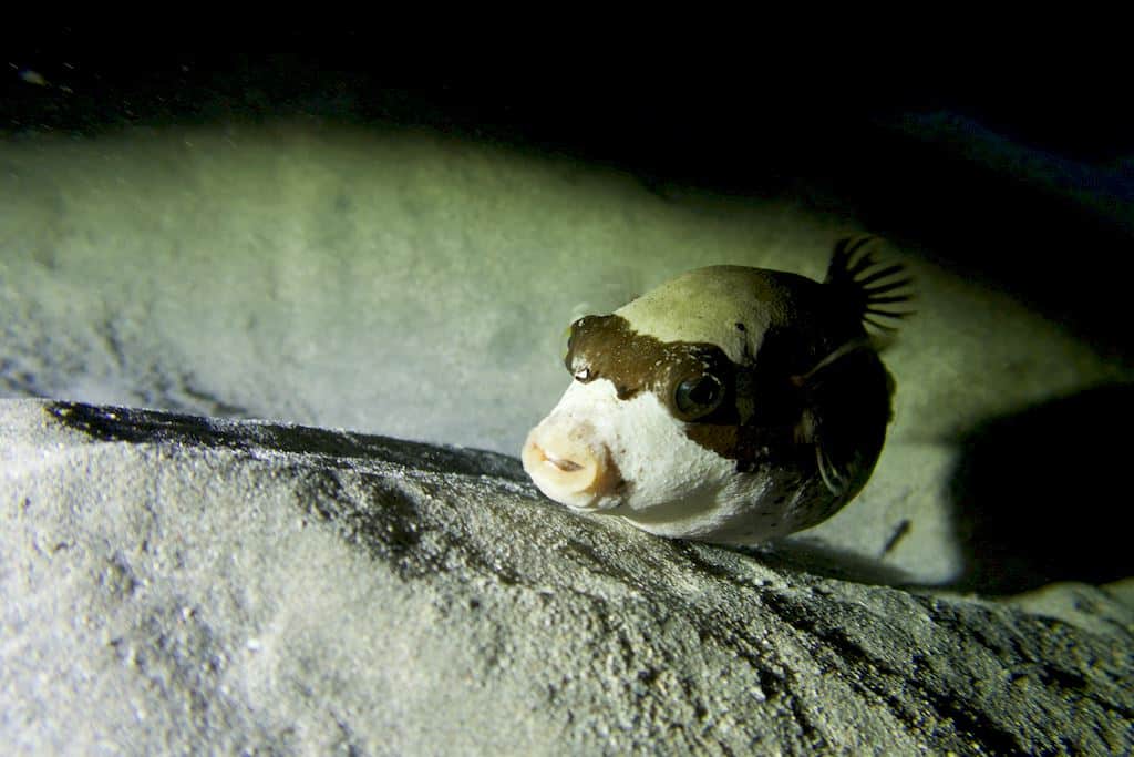 Je m’approche du petit animal en prenant soin de chasser la rascasse tout près à l’aide de ma lampe : « allez ouste, plus loin ». Nulle envie de sentir sa piqure.