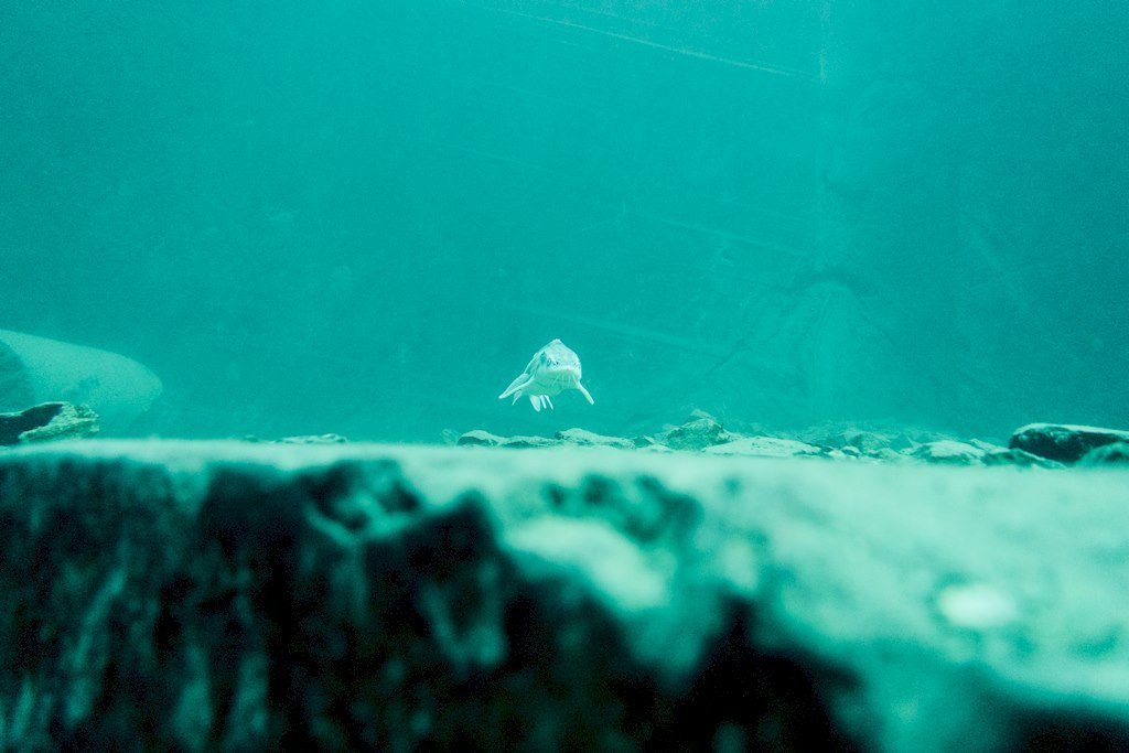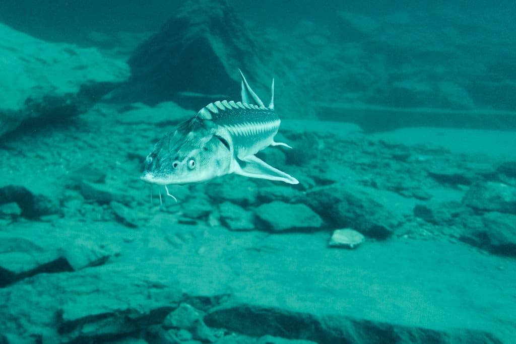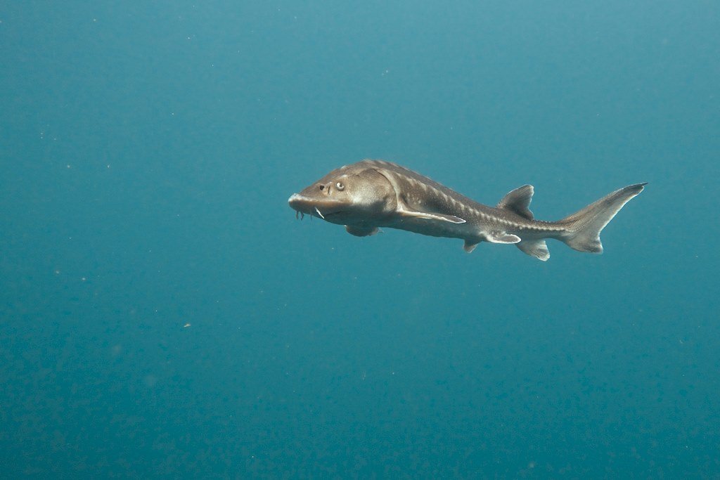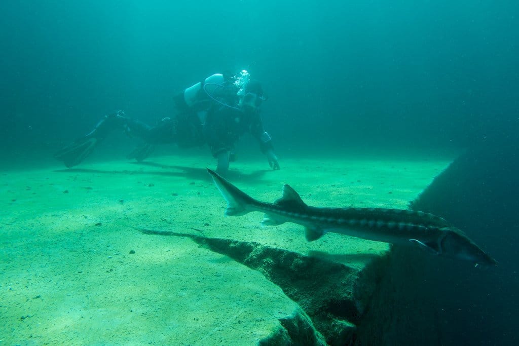 Quelques coups de palmes plus loin, surprise. Nous arrivons dans « la vallée », véritable pays des esturgeons : grands, petits, albinos,… De spécimen en spécimen, nous arrivons au point profond à une quarantaine de mètres et remontons doucement vers la zone de nourrissage impossible à louper.