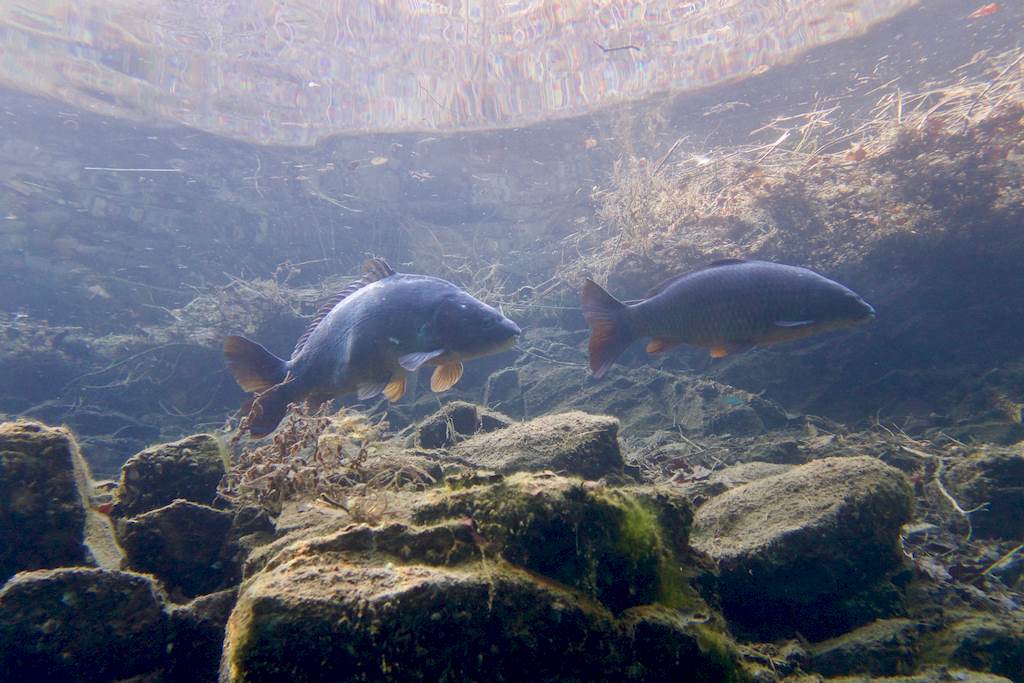 Des carpes et esturgeons se baladent tranquillement sur la plateforme à 5-6m et nous les observons sans difficultés tellement l’eau est limpide.