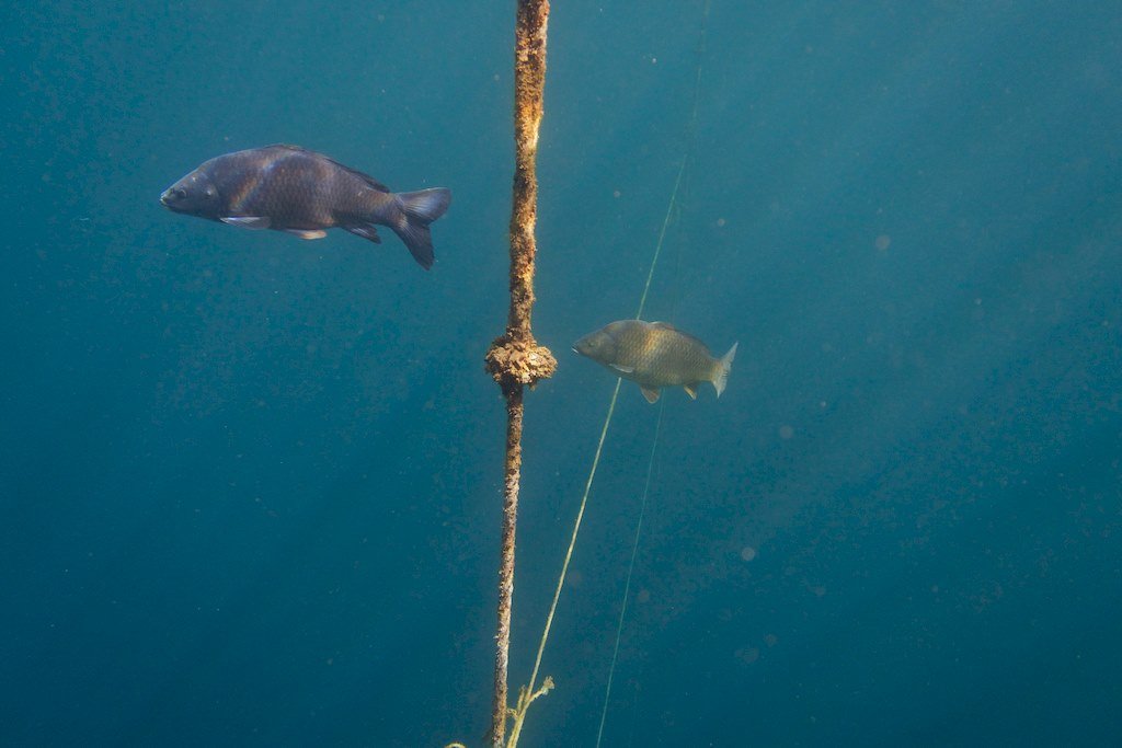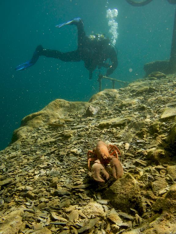 Perdu au milieu de nul part, un homard m’observe en silence pendant que les carpes s’amusent aux repères pour les paliers.
