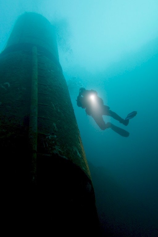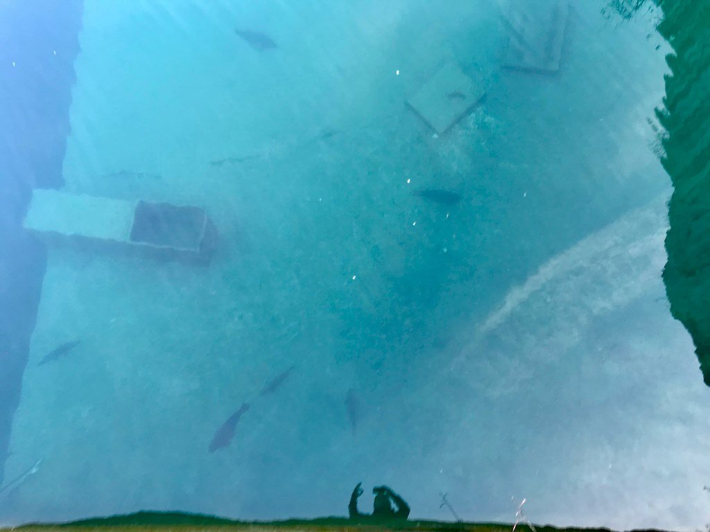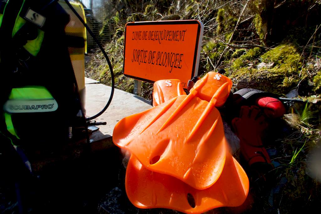 Après avoir mis mes palmes au bord de la plateforme, je me penche pour voir si aucune carpe ne se trouve en dessous. Je regarde le fond avant de me raviser et de décider de bien regarder au loin. Une main passée devant moi et tenant ma lampe, une autre sur le masque et c’est parti.