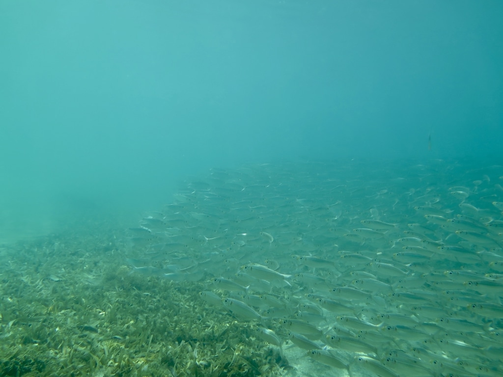Après quelques secondes de palmage en surface, mon naturel revient et je tente de piquer vers le fond pour entrer dans le banc de poissons juste en dessous de moi.