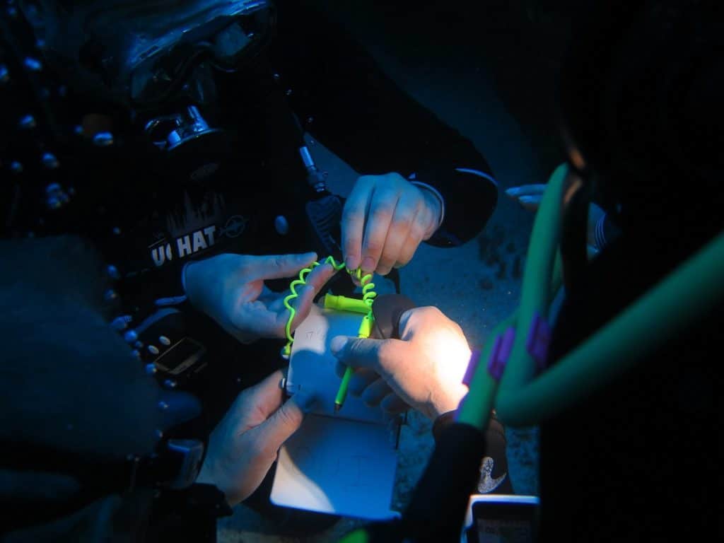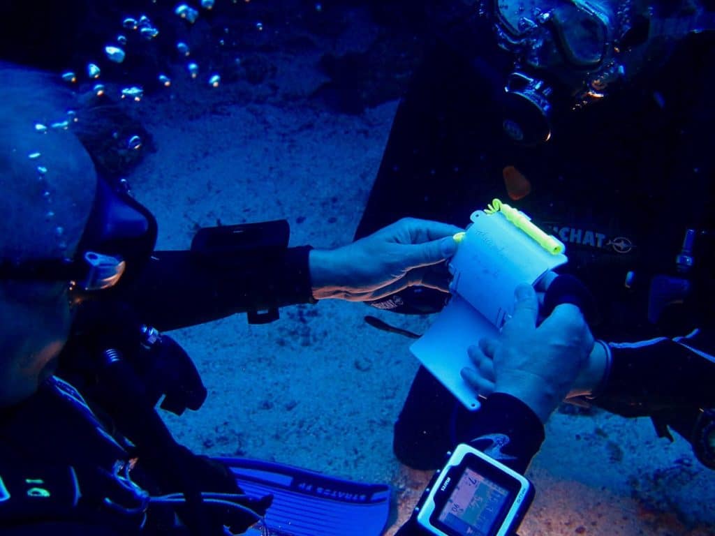 - Prévoyez éventuellement une plaquette submersible pour écrire votre demande (parler sous l’eau est nettement moins simple)